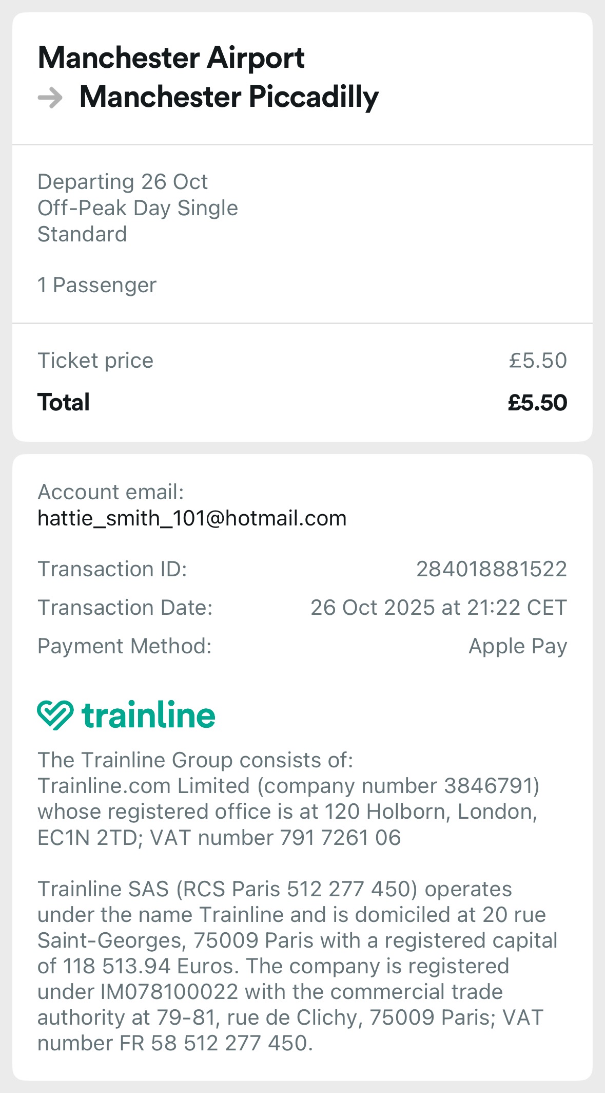 | 2025-10-26 | Train home : going on leave | 26.59 | GBP | 30.45 |