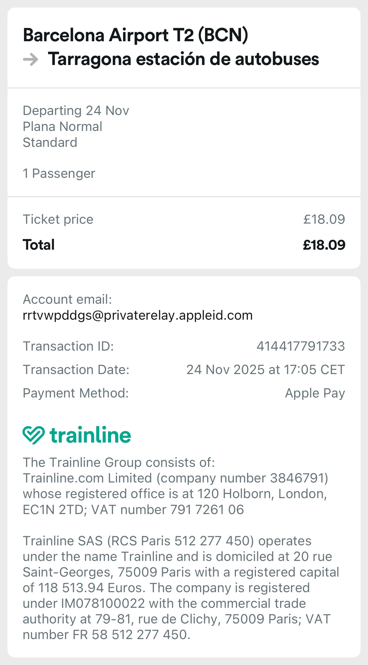 | 2025-11-24 | Bus ticket to Tarragona | 18.09 | GBP | 20.58 |